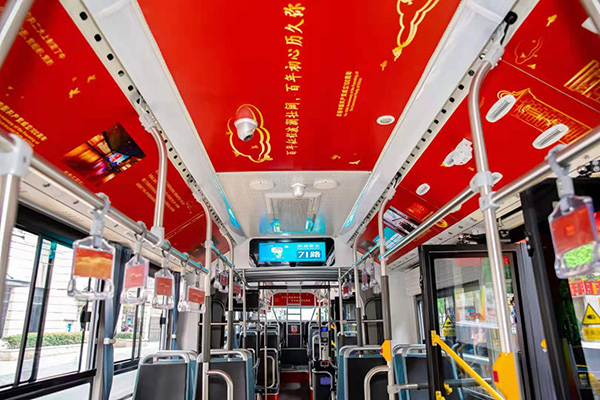“中共一大”公交主題專列全長18米,以紅色作為主色調,融合了建黨百年、中共一大召開地樹德里等元素。步入車廂,可見中共一大以及建黨百年征程的圖文資料,儼然一個行走在申城街頭的“微縮展廳”。主題專列還結合5G和多媒體設備科技賦能,將“中共一大”主題專列打造成全國首輛配備透明柔性屏的公交車,滾動播放一大會址及公益宣傳片。71路起訖站位于延安東路外灘,外灘站配置了71路紅色主題專列周邊產品的展銷設備,候車乘客可在設備上利用碎片時間來參與黨史答題、拼圖游戲等活動,學習黨史知識。
