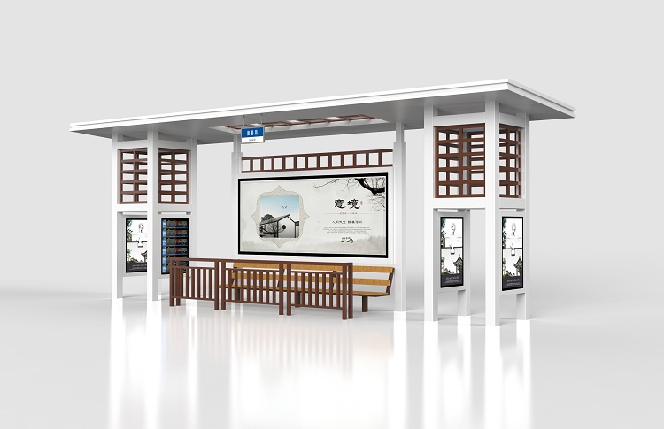 岳陽市在美城定制的新款智慧候車亭主體采用鍍鋅板材質,表面抗氧化能力強,能加強零件的抗銹蝕穿透能力;候車亭表面采用白色,設計上保留了古代建筑與現代藝術相結合的款式,視覺上給人一種古樸時尚之感。